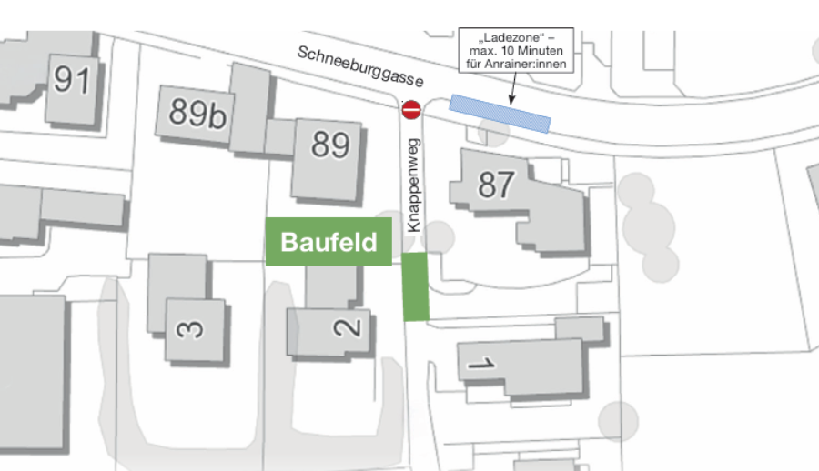 Die Grabungsarbeiten erfolgen im Knappenweg, daher ist die Zufahrt zu allen Anwesen im Knappenweg nicht möglich. Für die Dauer von vier Arbeitstagen ist der Knappenweg für den PKW-Verkehr untertags von 8.00 bis 17.00 Uhr gesperrt. Außerhalb der genannten Arbeitszeiten ist der Knappenweg für den Verkehr frei. Fußgänger:innen und Radfahrer:innen (schiebend) können das Baufeld jederzeit passieren. Für Anrainer:innen wird in der Schneeburggasse eine Ladezone mit zwei PKW-Abstellplätzen eingerichtet. Die maximale Parkdauer beträgt rund zehn Minuten. Wir versuchen, die Beeinträchtigungen möglichst gering zu halten, und bitten um Ihr Verständnis.